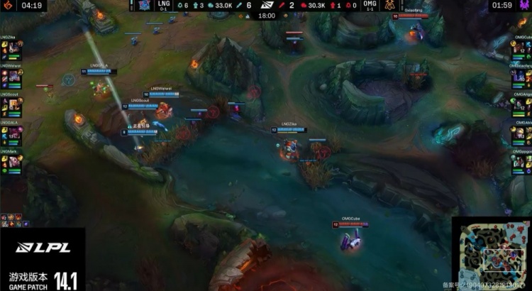【17:25】LNG收掉小龙,本局为火龙魂,随后LNG中路放出先锋推掉OMG一塔,阿卡丽与奎桑提TP中路绕后,LNG推掉OMG中路二塔,沙皇中路竖塔,奎桑提与阿卡丽大难临头各自飞。