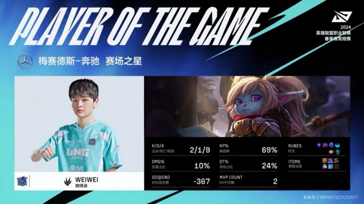 【9:52】NOC来中路草丛埋伏直接关灯飞沙皇脸,卡尔玛过来收掉沙皇,波比敲死阿卡丽,双方打出1换1后,兰博来中闪现红温狂A梦魇将其带走,LNG打出1换2经济领先2k。
