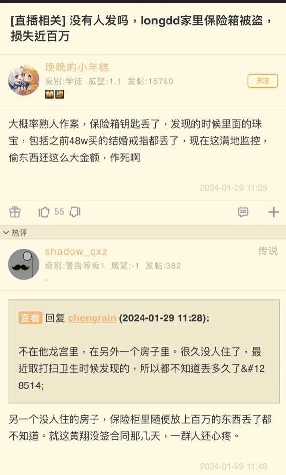 此事NGA网友也迅速作出跟进补充,是在另一个长期无人居住的家中被盗,Longdd尚不清楚具体被盗时间(以上为网络流言,难以辨别真假)