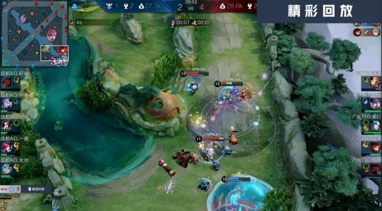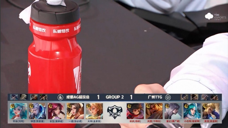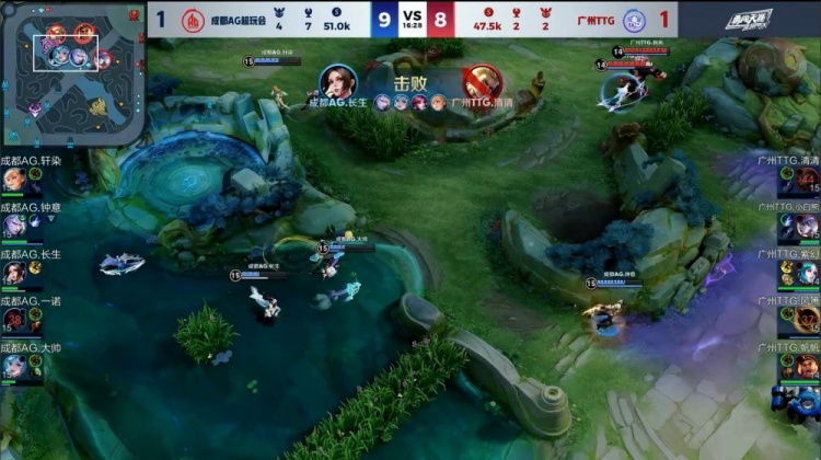 【9:22】小白熊推掉成都AG下路一塔,成都AG四人支援到位,帆帆没顶住伤害被长生收掉,长生后续被炸死,广州TTG打出1换2去开小龙,钟意配合一诺带走清清,广州TTG收掉小龙,经济领先2k。