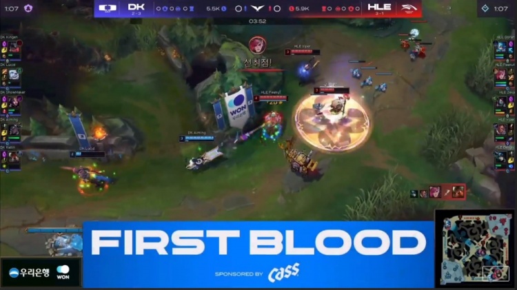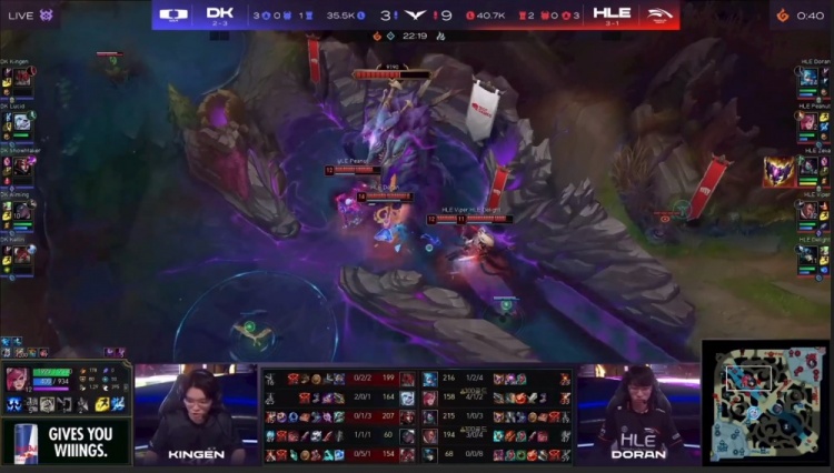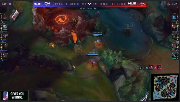 【18:00】HLE中路先锋白给先开小龙,Kellin泰坦一钩接大配合Aiming塞纳大招给控瞬秒了Peanut蔚,DK拿下小龙但是Zeka阿卡丽龙坑一打四强杀掉了Aiming塞纳!随后Kingen剑魔被Viper卢锡安+Doran格温拉扯也遭击杀!DK拿龙,HLE打出1换3!