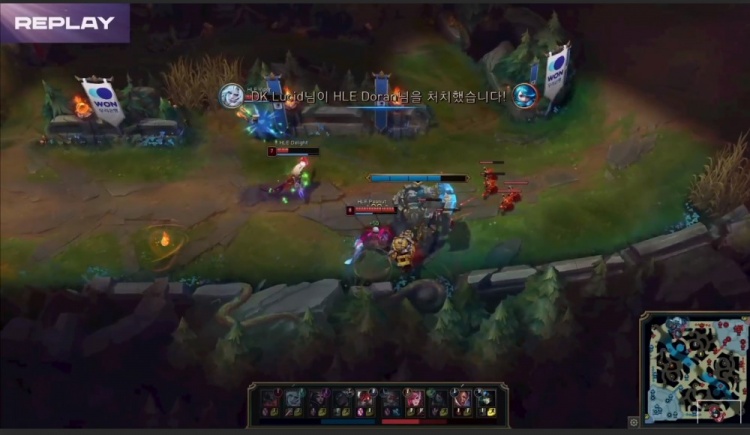 【14:36】ShowMaker乐芙兰断掉半血Doran格温回城,Lucid佛耶戈绕后大招将他斩死!HLE则是收下了峡谷先锋!HLE保持2K左右的经济优势!