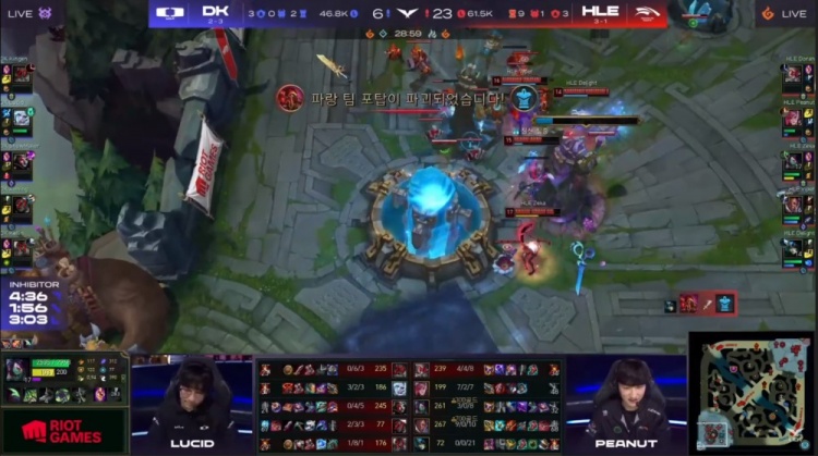 【28:16】Viper卢锡安高地骑脸单杀ShowMaker乐芙兰!HLE推掉三路高地想一波!DK想打但是钩接大招先手的Kellin泰坦瞬间被融!Lucid佛耶戈配合门牙塔换掉了Doran格温但是无济于事,HLE赢下首局!