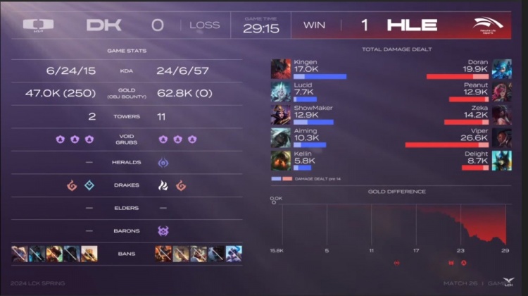 第一局比赛Kingen选出招牌剑魔但被反手的Doran格温对线压制,HLE持续让Viper卢锡安无解发育中期得到回报,团战Zeka阿卡丽+Viper卢锡安伤害DK只有泰坦能抗,Kellin泰坦一倒就只能溃败!Kingen剑魔几波团战无论是在前还是绕后都切不起来毫无作为!Viper卢锡安越打越猛高地骑脸单杀ShowMaker乐芙兰之后DK无力回天,HLE推掉三路高地,轻松拿下第一局!