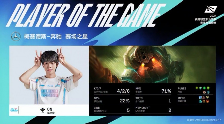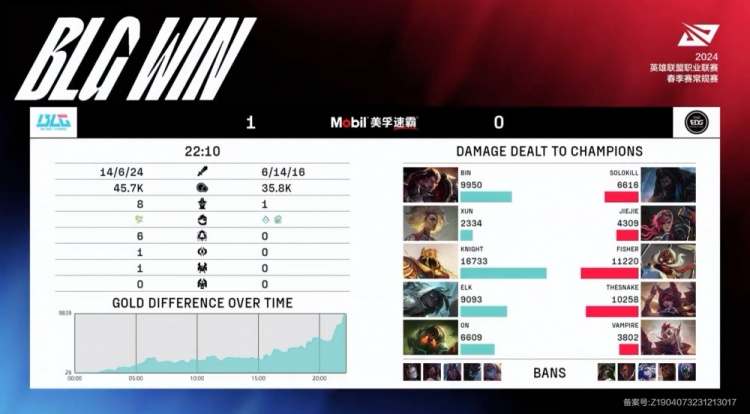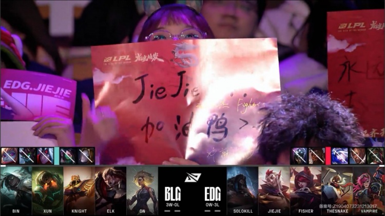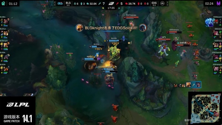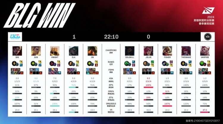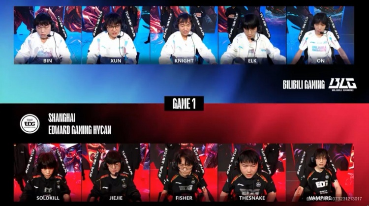 第一局前期Xun下路灵性绕后帮助BLG下路打开局面,没过多久BLG中上捷报频传,knight与Bin分别在线上单杀各自对手,BLG全线优势。小龙团Jiejie带队帮助Fisher库奇拿到双杀,BLG随后上路利用先锋直接撞上EDG门牙。最终BLG轻松收掉大龙,中路打出1换3一波推平EDG基地先下一城。