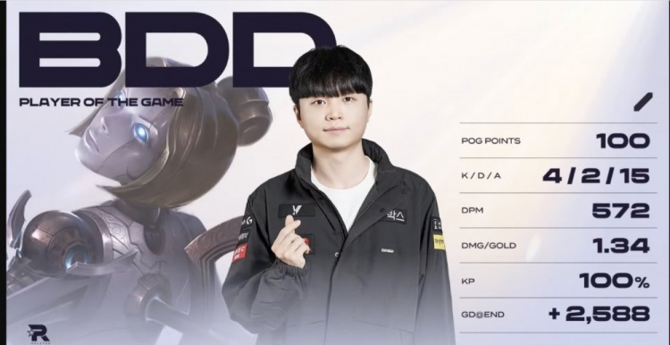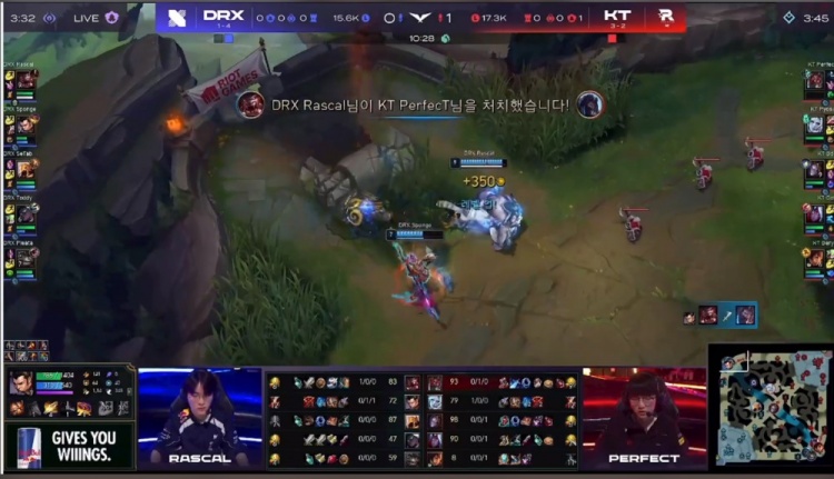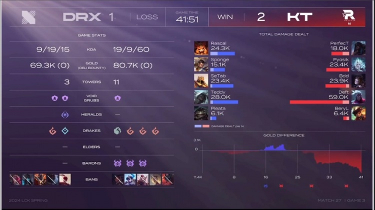 决胜局DRX前期两次击杀PerfecT乌迪尔,打完小龙团拿下3K的经济优势!但是中期又是rush大龙出现失误被Pyosik佛耶戈连续第三局抢下大龙从而帮助KT将劣势扳回!Teddy塞纳40分钟不到150层被动后期毫无作为,团战Rascal纳尔尽力但是独木难支,KT收下火龙魂之后打团无限好打,最终KT推掉三路高地之后团灭对手,让一追二翻盘DRX!