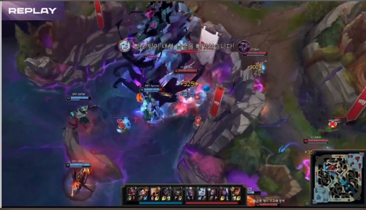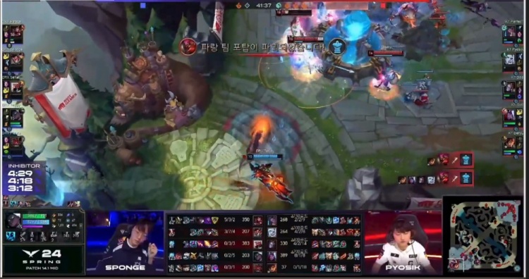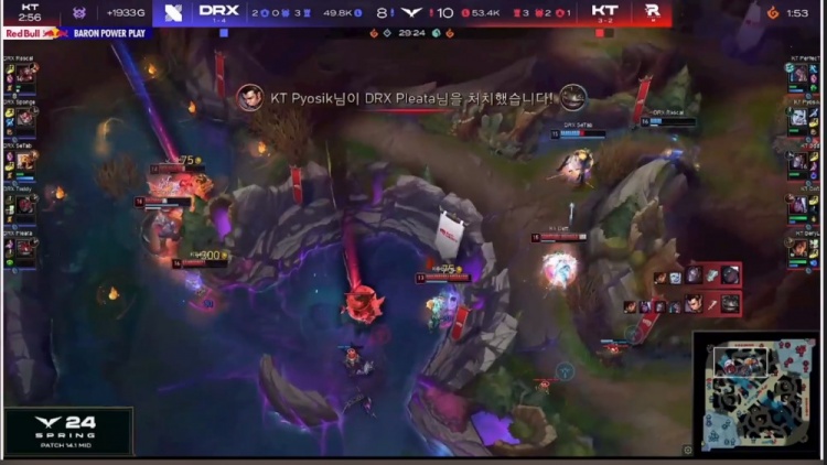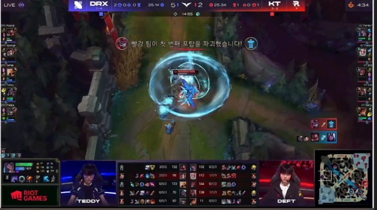 【21:32】DRX抱团rush大龙,但是Pyosik佛耶戈再次立功,大招进场顶着DRX众人的脸第三次抢到了大龙!Sponge赵信还被留了!KT经济再次反超了!