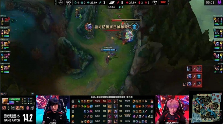 【19:51】小炮上路推进拔掉EDG二塔,经济领先5k。