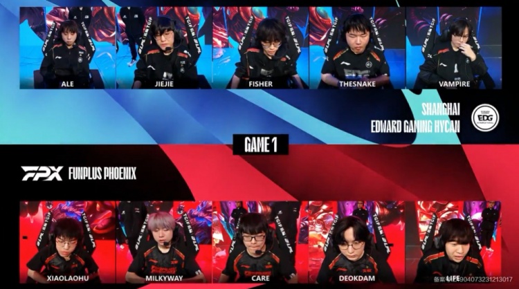 蓝色方EDG:Ale剑魔、Jiejie芮尔、Fisher沙皇、Thesnake霞、Vampire洛