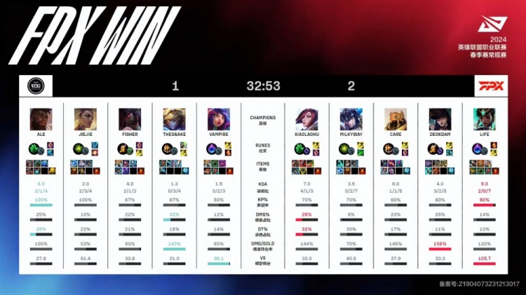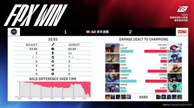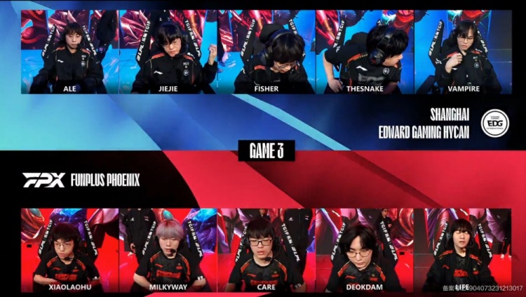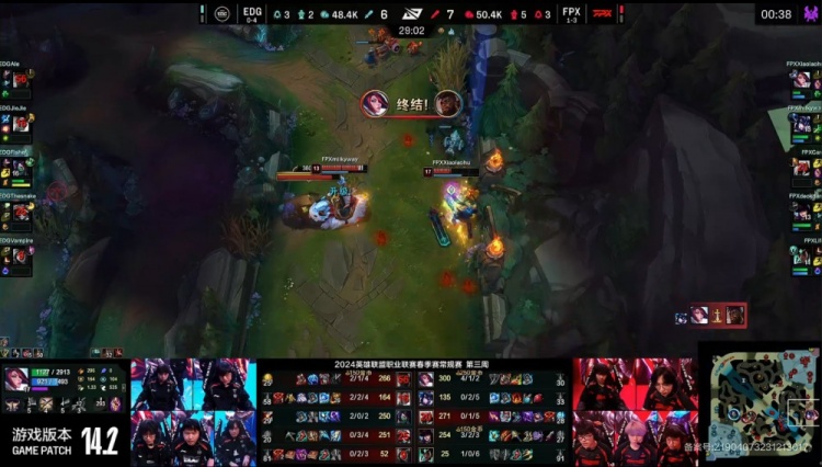 中期Jiejie持续发力抢掉两调小龙一条大龙想要帮助EDG稳住局面,但后续小龙团FPX打出1换4,Xiaolaohu剑姬双杀到手,FPX经济优势来到6k。最终FPX推平EDG三路,大军压境,FPX强行点掉EDG基地,以2-1拿到比赛胜利。