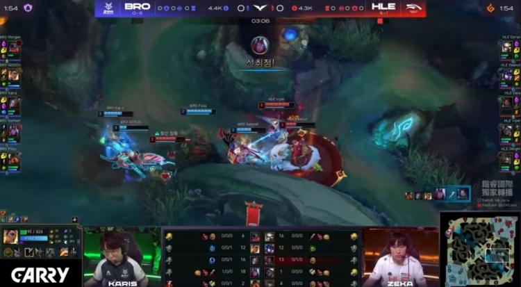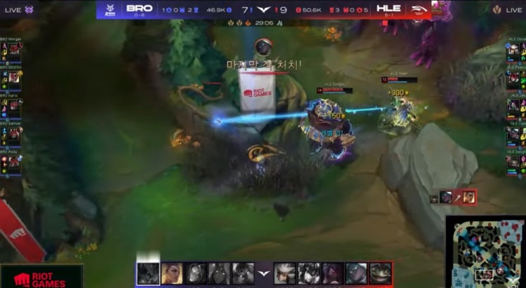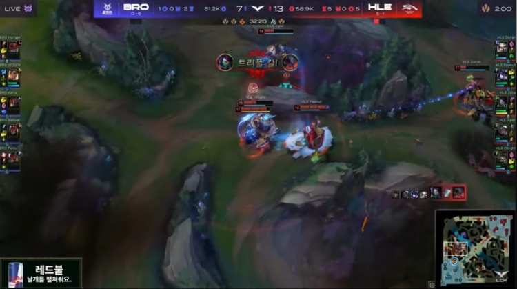 【32:00】河道开团,卡蜜尔冲进人群硬盖被融化,阿卡丽瞬间秒掉BRO双C,后续阿卡丽拿到三杀无人可挡,HLE打出0换4,一波推平BRO基地拿到比赛胜利。