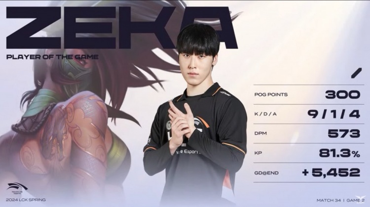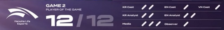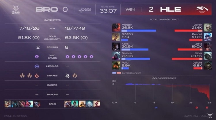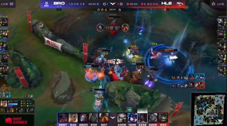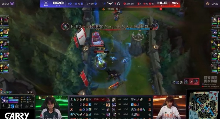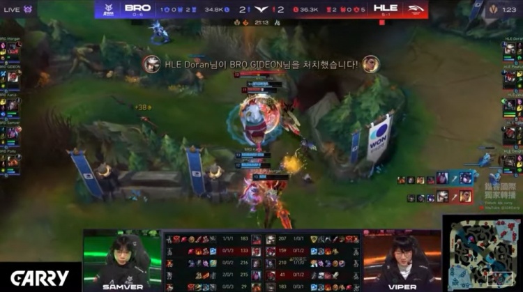 第二局前期莎士比亚局双方比拼兵线运营,HLE技高一筹拿到2k经济优势。中期小龙团Doran卡蜜尔绕后被秒,BRO听牌土龙魂拉平经济差距。但紧接着大龙河道Zeka阿卡丽收割BRO双C,双方打出2换2。龙魂团Zeka人群游龙,HLE团灭BRO将经济优势扩大到4k。后期Zeka三杀收尾无人可挡,HLE一波推平BRO基地将其横扫拿到比赛胜利。