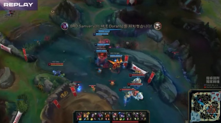 【11:30】塔姆下路W近身,卡蜜尔TP来下闪现想盖人未果,BRO双人组回塔,随后HLE收掉小龙,本局为土龙魂。