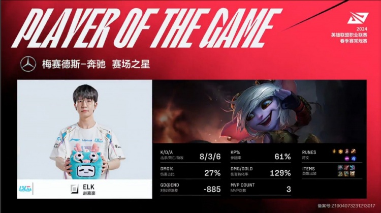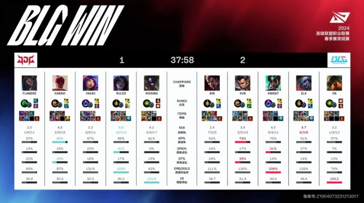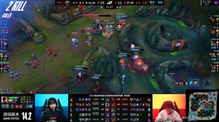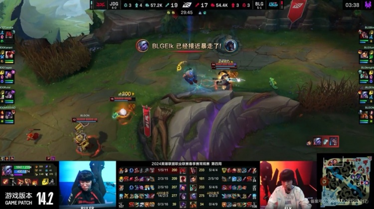 后期JDG收掉大龙,BLG包夹过来,ON先钩Yagao再钩Ruler,Elk小炮三杀收割,BLG打出3换5但经济依然落后3k。JDG之后再拿大龙,BLG依靠Elk与阿Bin的推线将经济劣势稳定在3k左右。