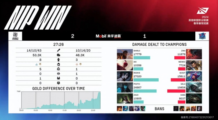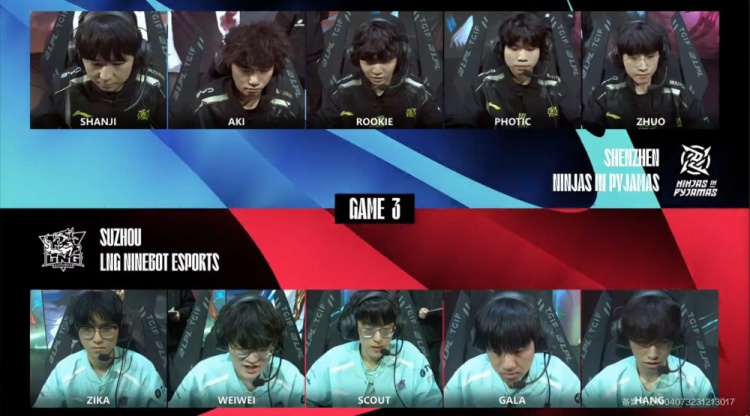 第三局前期小龙团Photic双杀到手但随即被LNG四人包下击杀,GALA赛娜拿到终结。上路团战shanji奎桑提勇往直前双杀到手,NIP打出0换2经济领先3k。中期小龙团NIP打出0换2准点收掉大龙,LNG众人纷至沓来打出2换4,将经济劣势保持在2k。后期团战Aki盲僧踹飞GALA,shanji奎桑提直接将其R过墙单秒,紧接着NIP打出0换3一波推平LNG基地,完成让一追二拿到比赛胜利。