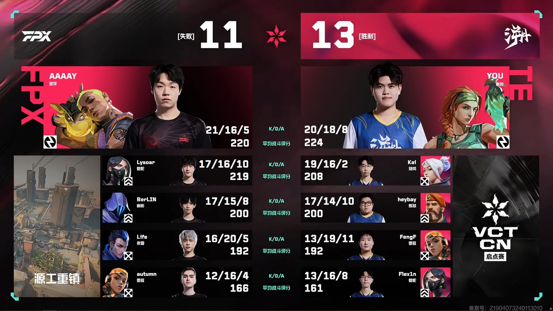 下半场攻守转换,TE延续火热手感赢下手枪局并利用经济优势持续连胜将比分逐渐拉开。来到第十五回合,AAAAY率先出击斩下两波三杀帮助FPX稳住局势将比分持续紧追,比分来到11:11,TE叫出最后的暂停尝试终结比赛。暂停之后,TE完成反清顺利拿到盘点,并在最后二打一的残局下稳稳拿下图二的胜利。MVP给到了YOU。