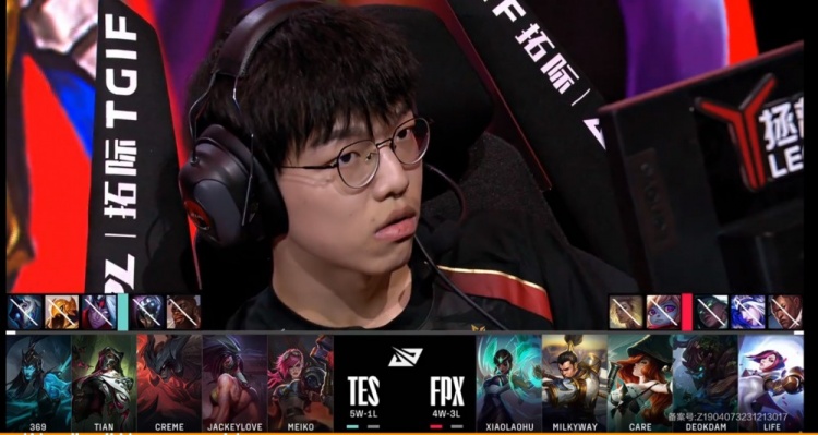 TES:上单369、打野Tian、中单Creme、下路JackeyLove、辅助Meiko
