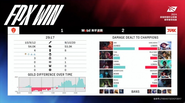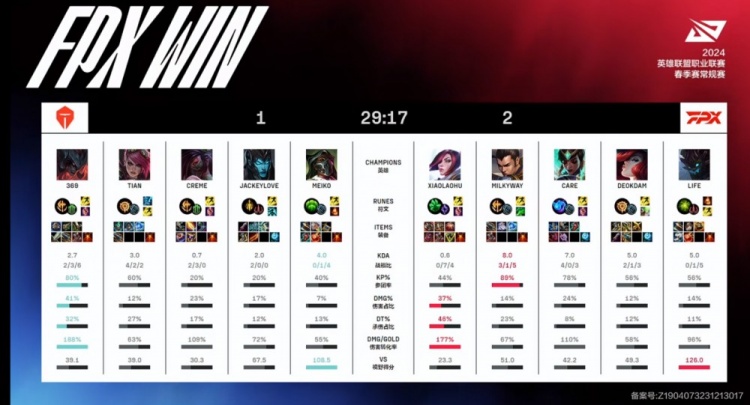 决胜局FPX选出大树女枪下路组但是一直没能打出大招配合,虽然巢虫团FPX双C各自双杀打出1换4,但是上路369剑魔成功单杀xiaolaohu剑姬之后Tian蔚连续四次配合剑魔抓死剑姬,TES局势稳中向好之际变故突生!上路抓死剑姬之后TES转头大龙,FPX三人带着兵线推中路高地,TES只回了一个Creme阿卡丽清不掉线,369剑魔被Life大树打断没能回城,FPX直接无视阿卡丽,一波推家收下了比赛的胜利!爆冷击败TES!
