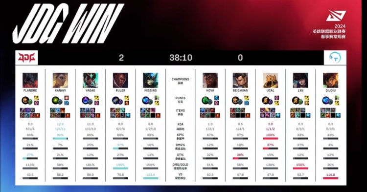 JDG:上单Flandre、打野Kanavi、中单Yagao、下路Ruler、辅助Missing