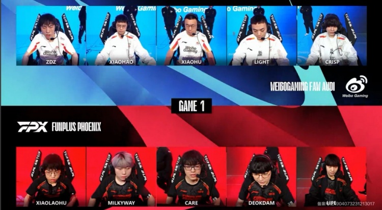红色方FPX:Xiaolaohu奎桑提、milkyway千珏、Care妮蔻、Deokdam伊泽瑞尔、Life艾希