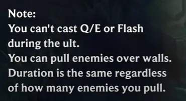 注:【R技能】毒刺贯体释放期间不能使用闪现、【Q技能】撼地/擎天、【E技能】以绪塔尔冲击,但是【R技能】毒刺贯体可以吧敌人拉过墙,不论同时命中多少个敌方英雄,【R技能】毒刺贯体的控制时间都是一样的。