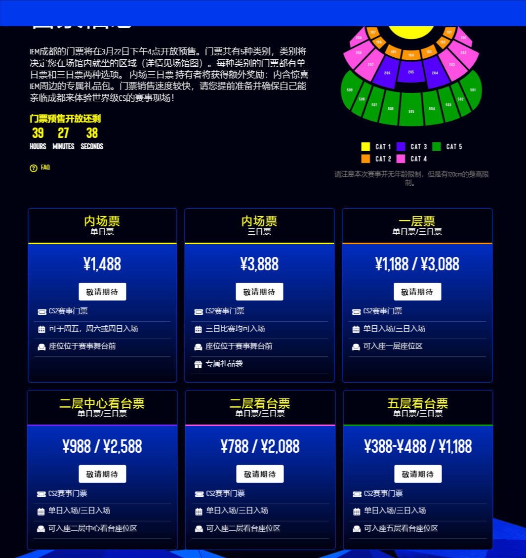 直播吧03月20日讯 ESL官网已公布IEM成都站票价。门票共有5种类别,每种类别的门票都有单日票和三日票两种选项。 内场三日票持有者将获得额外奖励:内含惊喜IEM周边的专属礼品包。