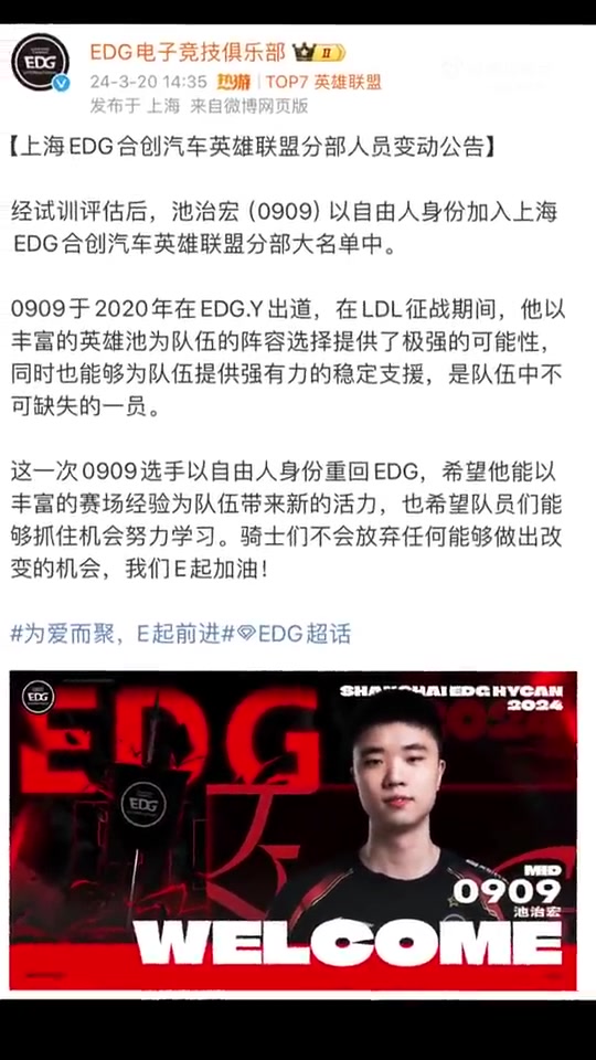 直播吧3月20日讯 EDG官宣原EDG.Y中单0909以自由人身份加入队伍,随后EDG抖音账号分享0909采访视频。
