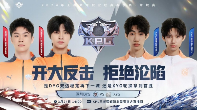 直播吧3月24日讯 2024KPL春季赛今日第一场比赛是由深圳DYG对阵到XYG!