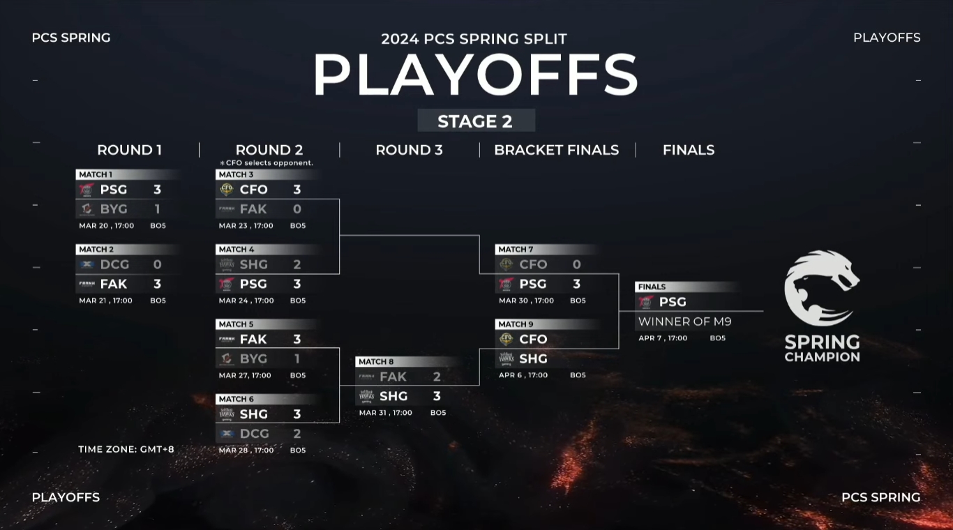 直播吧3月31日讯 2024PCS春季季后赛,今年PCS赛制的大改动让季后赛看点拉满;来自东南亚PCS、日本LJL、大洋洲LCO的队伍将同堂竞赛。