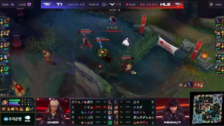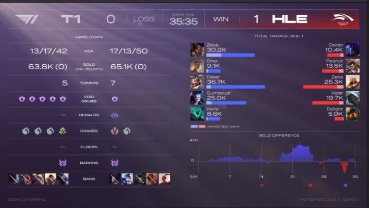 首局对线期T1四线优势,中期借助Zeus卡牌大招绕后赢团累积到4K的经济差!但是HLE的团战阵容借助一波大龙团声东击西秒Gumayusi金克丝翻转了战局!二大龙团HLE再次依靠三核心的操作打了个2换4但是没能一波,T1借助绕后TP击杀HLE上辅两人之后收下大龙+水龙魂!最后一波高地团Doran雷克塞击飞两个,Viper塞纳定住了Gumayusi金克丝,HLE最终推掉裸水晶赢下首局!