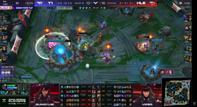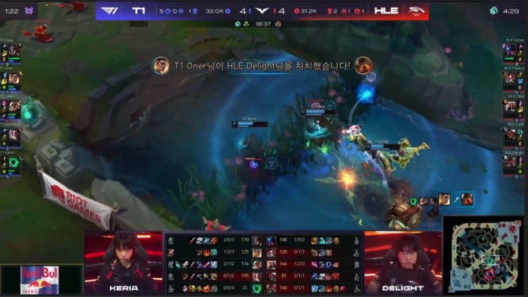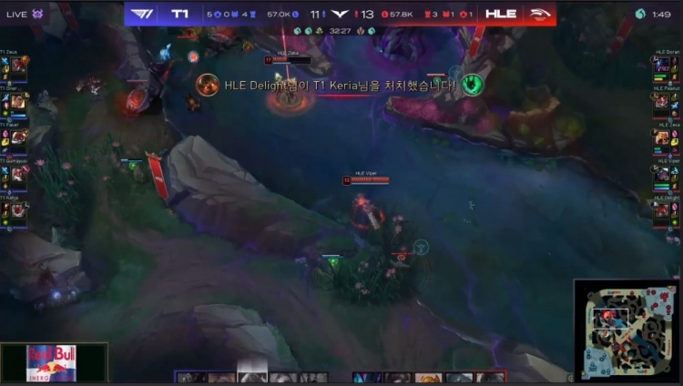 【32:11】T1拍大龙,Faker导弹包库奇没有TP埋伏笔了!Zeus卡牌吃钩被集火强杀!Zeka沙皇再次进场推两个帮助HLE打出2换4!HLE想从中路一波!但是Oner芮尔拖到了Gumayusi金克丝复活,配合T1绕后TP留住了Doran雷克塞+Delight泰坦!但是HLE也推掉了T1中路高地+双门牙塔!T1随后拿下大龙+水龙魂!