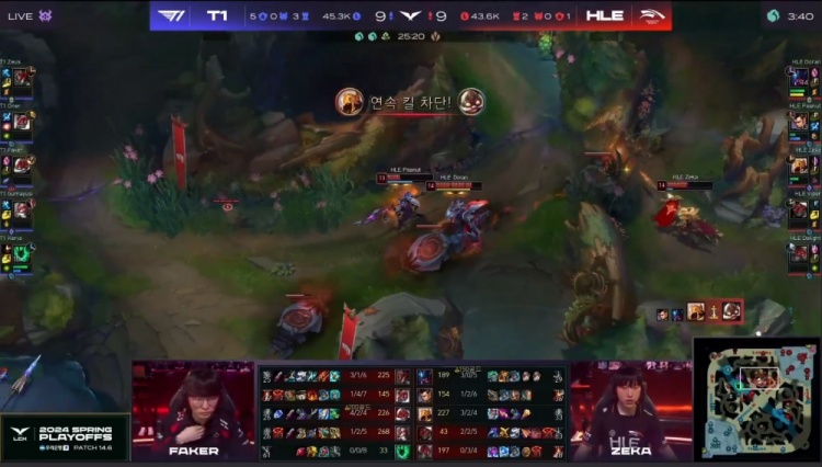 【25:10】HLE再次拍大龙,Oner芮尔再次被集火,Keria锤石大招摆三个,但是HLE项庄舞剑意在沛公,Doran雷克塞大招强杀掉了Gumayusi金克丝!Faker库奇击杀换掉Viper塞纳,Zeka沙皇7字进场闪现推回两个!最终Doran雷克塞留住了反向逃生的Faker库奇,HLE打出2换4!拿下大龙!