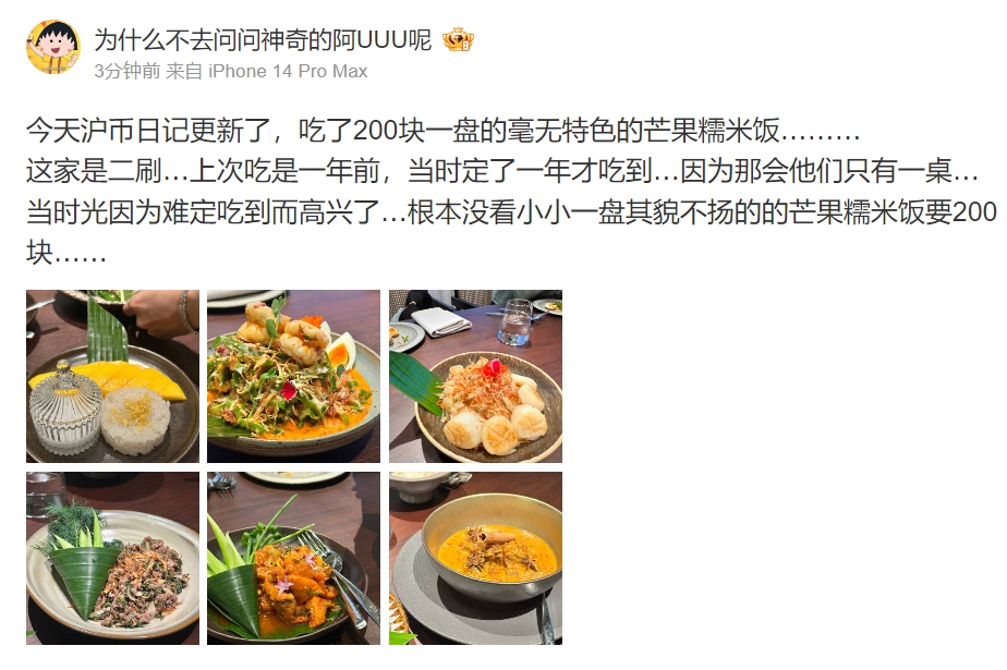 >大网红也撑不住!UU妹吐槽上海餐厅:一小碗芒果糯米饭 200块!