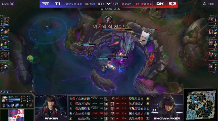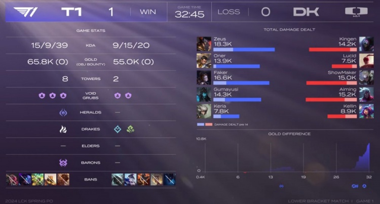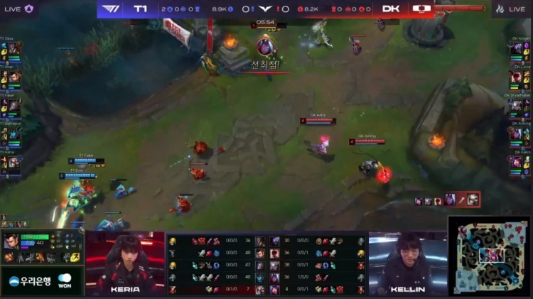 第一局前期两边互有来往,T1依靠Oner赵信支援顶住局势,Keria青钢影K完头就幽默开送还害死Gumayusi卡莉斯塔!双方在16分钟才拿下第一条小龙!中期团战DK一波冒进没秒掉Oner赵信,被Faker发条转大逼出双金身,T1处理掉Aiming维鲁斯之后完成团灭收下大龙,随后下路团战又是T1一波操作连续团灭DK,直接结束第一局比赛!