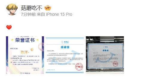直播吧4月9日讯 抖音英雄联盟主播陈泽在他的个人社交媒体晒出他收到的感谢信,图片中显示陈泽参加了抖音官方(字节跳动)举办的对"孤独症群体"的公益活动;他也倡导并带动更多公众一起支持孤独症群体,让他们能够融入正常的生活。