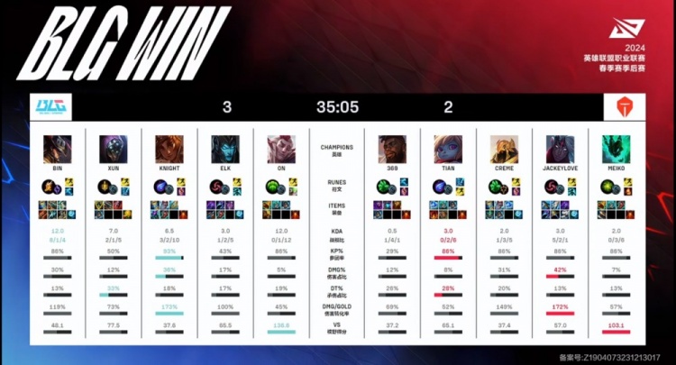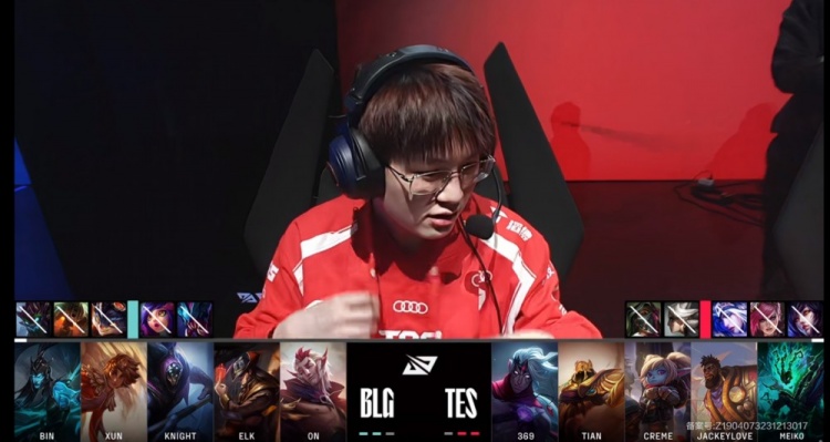 BLG:上单Bin、打野Xun、中单knight、下路Elk、辅助ON