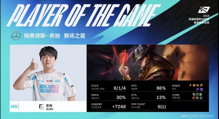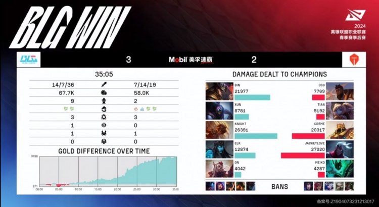决胜局开局TES借助换线+Meiko锤石操作拿下小优,不过中期BLG借助补回发育的Bin卡牌上路追击0换2之后先拿下大龙!TES拿下三条小龙但是迟迟拿不到龙魂!Creme沙皇逆风站了出来龙坑一推二用命帮助TES抢下大龙,但是BLG经验老到,Xun贾克斯+Bin卡牌带队追击推掉TES上路高地还给了TES一个团灭!决胜龙魂团BLG四人牵扯帮助Bin卡牌偷家获胜!BLG成为了LPL第一支进军成都MSI的队伍!