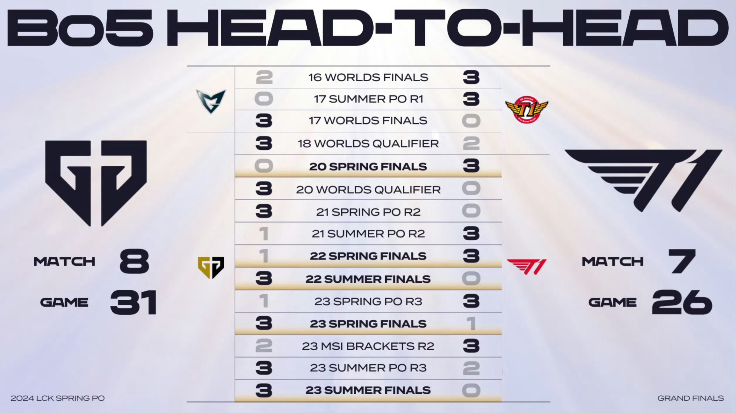 直播吧4月14日讯 今日LCK春季赛将迎来最终决战,对阵双方为T1与GEN,赛前官方直播间给出了两支队伍的历史交手记录,其中GEN取得八次胜利,T1取得7次胜利!