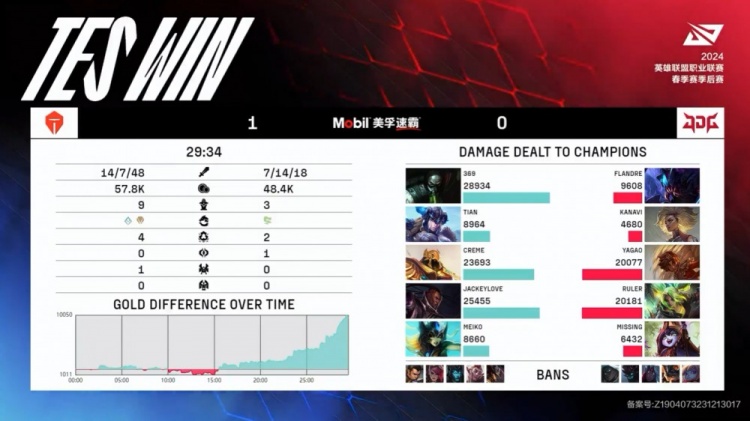 第一局369选出厄加特对阵Flandre雷克塞,前期小天下路gank帮助Jackeylove拿到一血,但随即Meiko连续阵亡两次,先锋团Yagao岩雀先抬到TES三人,Ruler间瞬双杀,但马上Creme沙皇绕后推到JDG三人,TES打出2换4双方经济持平。