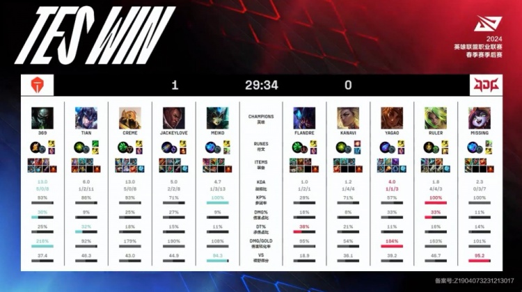 中期小龙团Kanavi芮尔连续吃控被秒,369厄加特架炮狂轰带走三杀,TES拿到4k经济优势。后期TES大龙逼团打出0换3吃掉大龙,最终TES中下两路推进拆掉JDG基地先下一城。