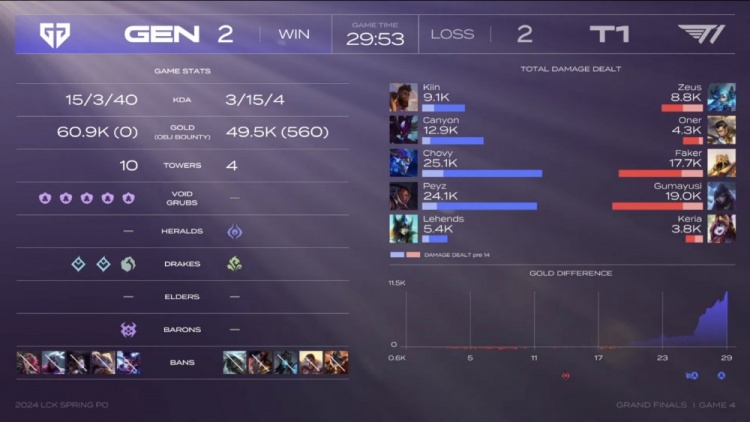 第四局Canyon选出招牌卡兹克,在野区压制住了Oner赵信还单杀找回场子!GEN在前期下路被压的劣势下顶住局势,中期GEN也是一波草丛埋伏打残Oner赵信,随后抱团rush掉大龙之后借助Chovy龙王大招展开追击,团灭T1之后确立胜势!最终的高地团Chovy龙王大招一砸三瞬间融化Keria璐璐,GEN一波结束第四局扳平比分!