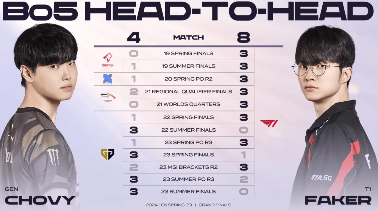 BO5大场方面,两人共计交手13场,Chovy 5胜、Faker 8胜;