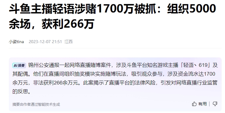 而斗鱼平台停播的大主播并不止小团团一位,主播“轻语619”在2023年12月已被锦州公安通报,轻语涉赌1700万,组织5000余场抽奖,非法获利266万余元。