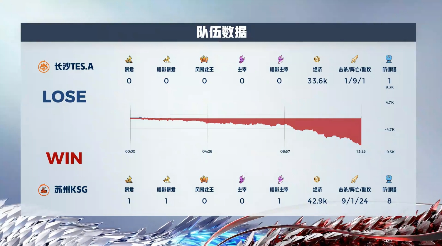 3分30秒,双方在中路交锋以一换一;4分30秒,苏州KSG轻语 (谢欣臻)孙策野区果断开大击杀弈星,最终苏州KSG以零换二并反到蓝buff,拿到开局优势;9分钟,苏州KSG发现并留下绕后的兰陵王,轻语(谢欣臻)孙策开大乘胜追击再留张飞;10分30秒,苏州KSG顺利拿下暗影暴君,点破对方中路高地同时反下红buff;12分20秒,苏州KSG拿到暗影主宰,将经济差扩大至7k;13分钟,长沙TES.A上高主动开团,但苏州KSG凭借巨大经济优势成功反打,全队冲破水晶赢得胜利,确认锁定季后赛胜者组!