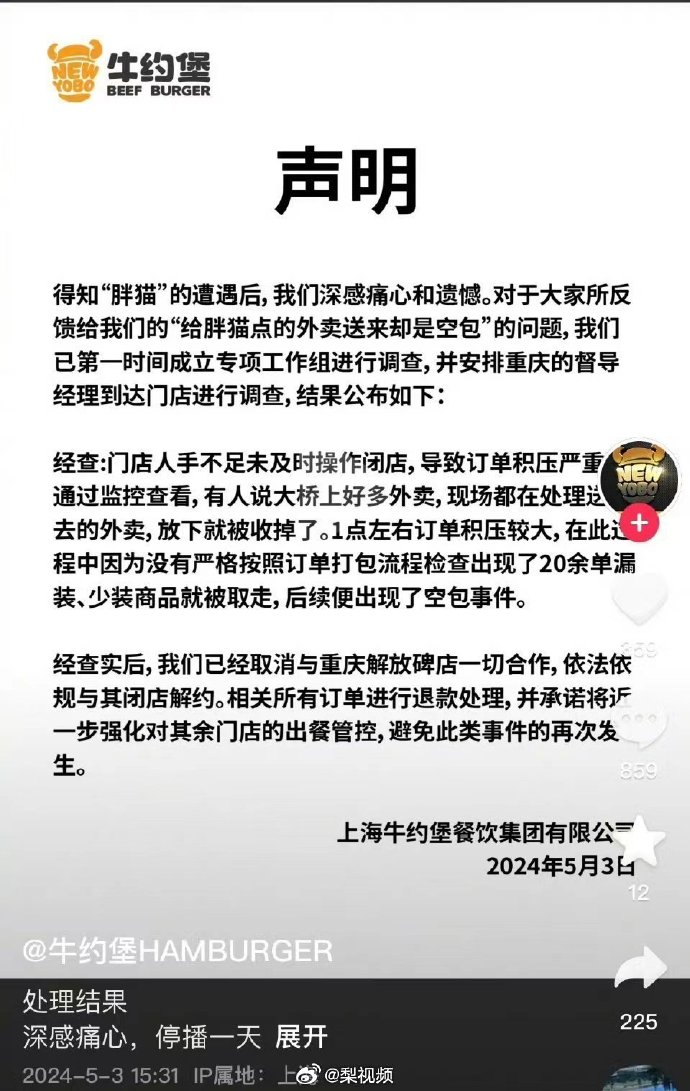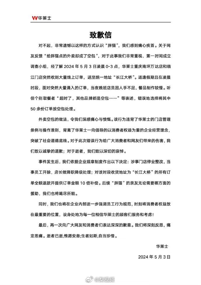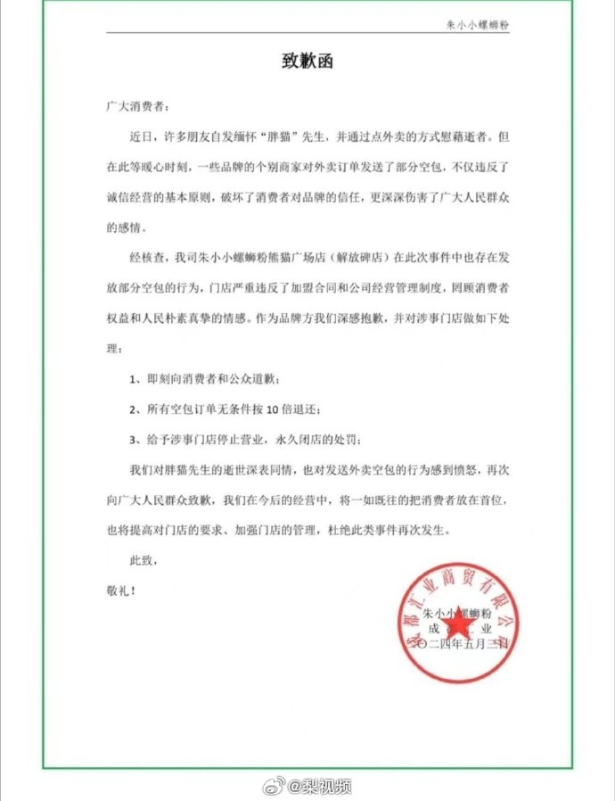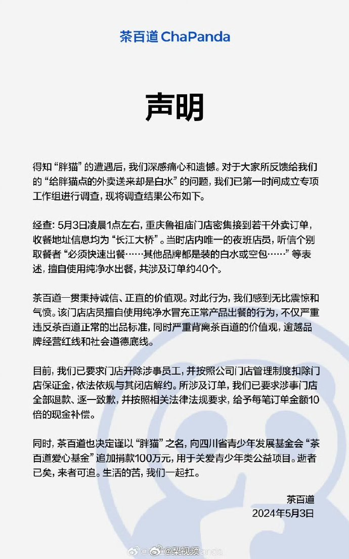 对此茶百道、朱小小螺蛳粉、牛约堡、华莱士分别就胖猫事件发布声明致歉,茶百道捐款100万,朱小小螺蛳粉、牛约堡涉事门店永久闭店!