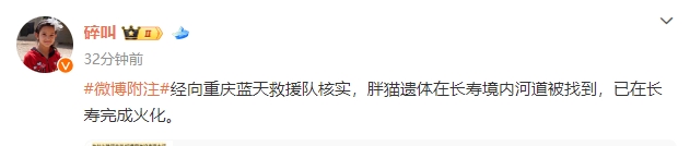 不过权威媒体人“江宁婆婆”和“碎叫”证实,“胖猫”事件在人命方面没有反转,并且媒体人已向救援队核实,胖猫遗体已被找到,且已完成火化。
