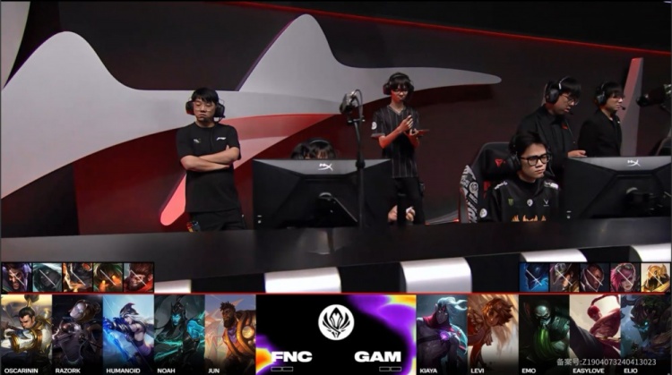 蓝色方FNC:Oscarinin奎桑提、Razork赵信、Humanoid发条、Noah卡莉丝塔、Jun艾希