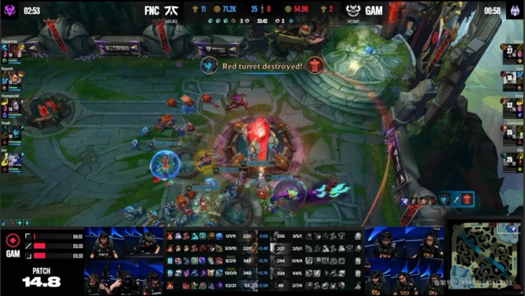 中期双方开始补兵运营,FNC下路推进打出1换3经济优势来到8k,最终FNC中路打出0换3收掉大龙经济优势来到1w以上,GAM再无一战之力被FNC在上路团灭,FNC一波推平GAM基地先下一城。
