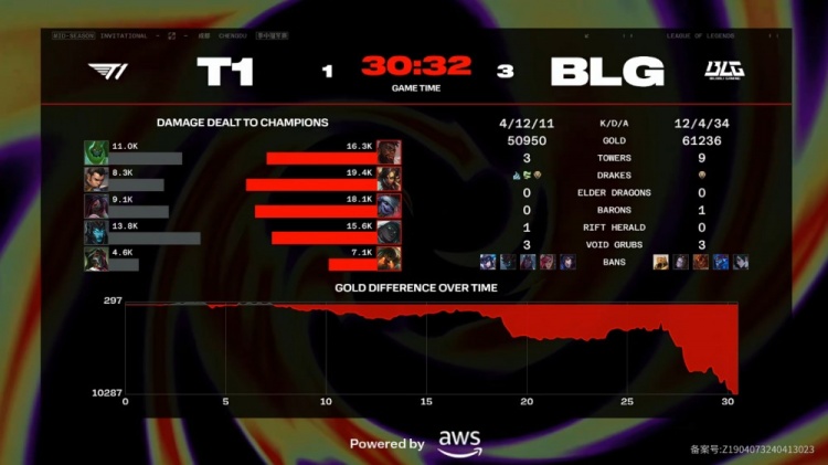 最终BLG下路推进,小吕布又被ON钩到后阵亡,BLG摧枯拉朽一波团灭T1,冲上T1高地推平基地,以3-1的比分拿到比赛胜利晋级胜者组决赛,T1则掉入败者组对阵TL。
