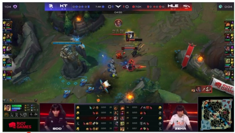 首局比赛Delight芮尔gank中路让Zeka卢锡安拿下一血,随后Bdd库奇就在小龙团三杀收割!随后双方不断开打,又是小龙团Delight芮尔吸三个反倒让PerfecT鳄鱼找到机会切死Viper泽丽!这波KT打出0换5团灭HLE拉开经济差!